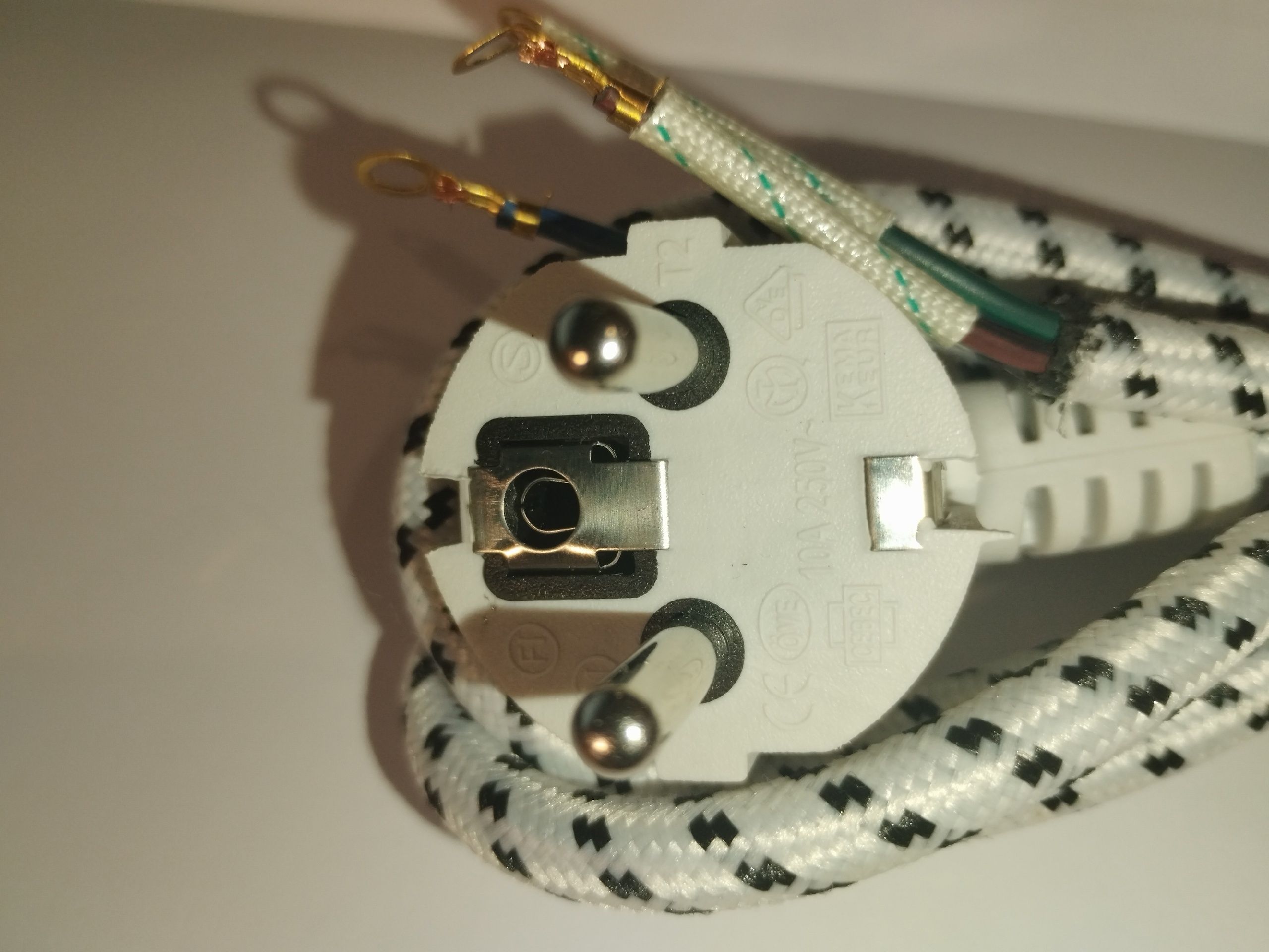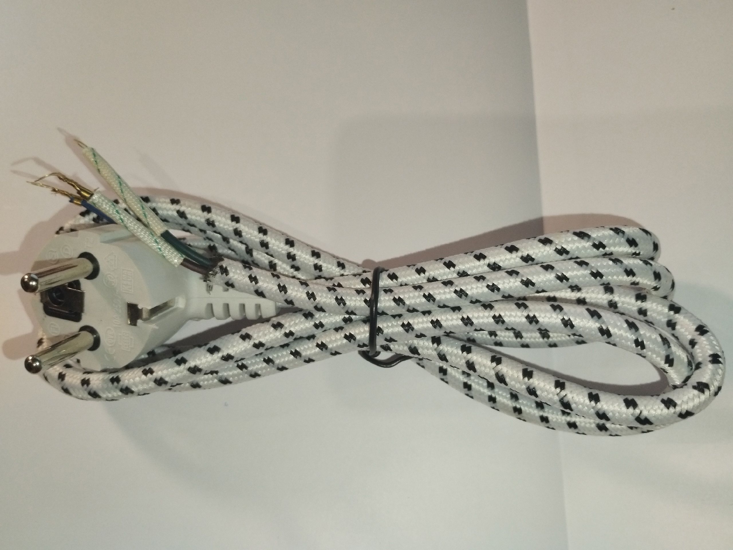 Тканевая изоляция (оплётка), кабель трёхжильный многожильный, медный 0.75 мм, устойчив к изломам, облуженный провод и контакты, провод трех жильный (фаза, ноль и земля) изолированная медная клемма, пламя защита, термозащита, литая вилка 10 А (2.2 кВт) вилка имеет защиту от излома, длина кабеля 1.5 м. Запчасть универсальная.